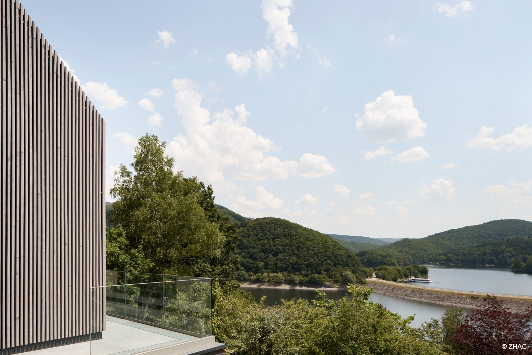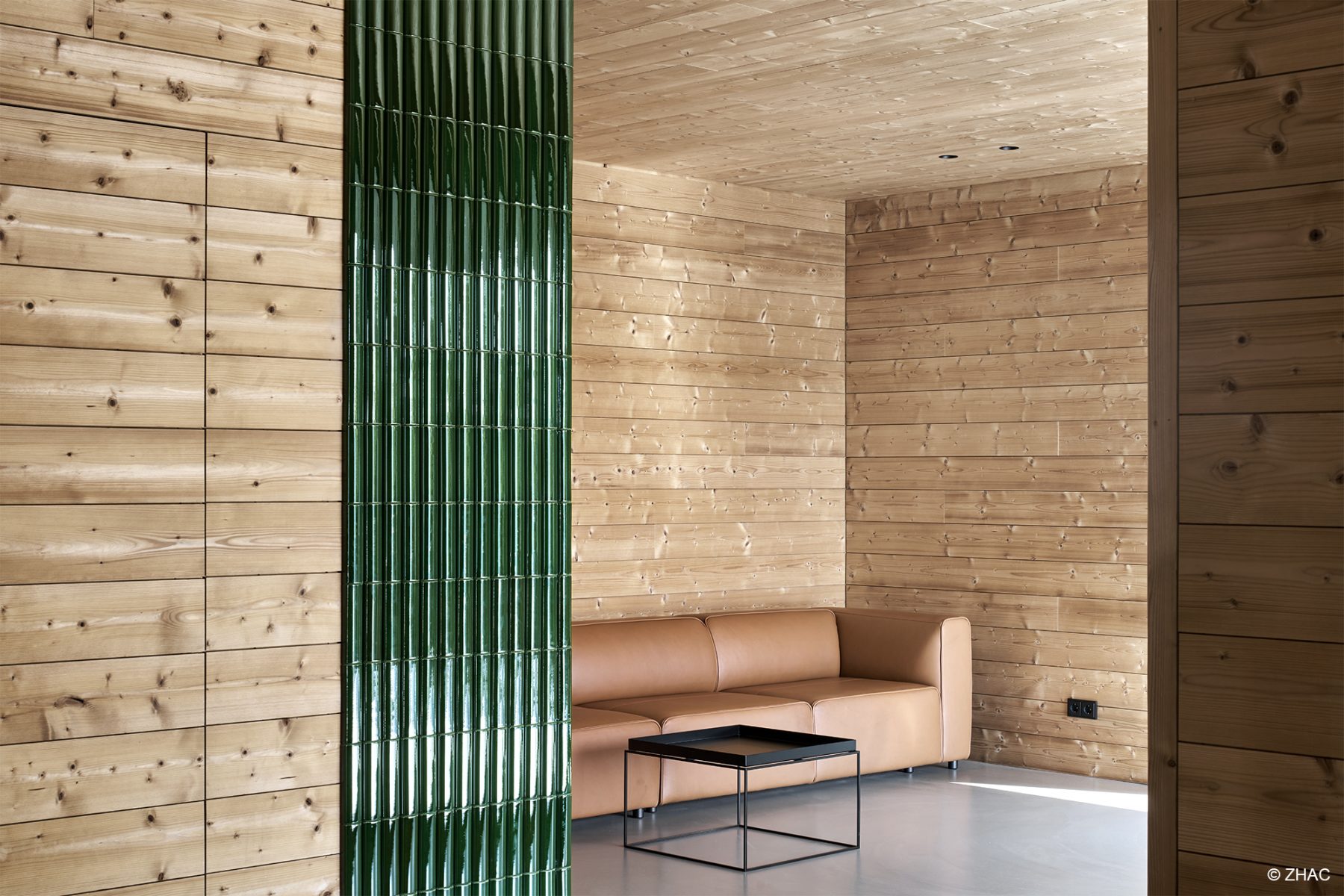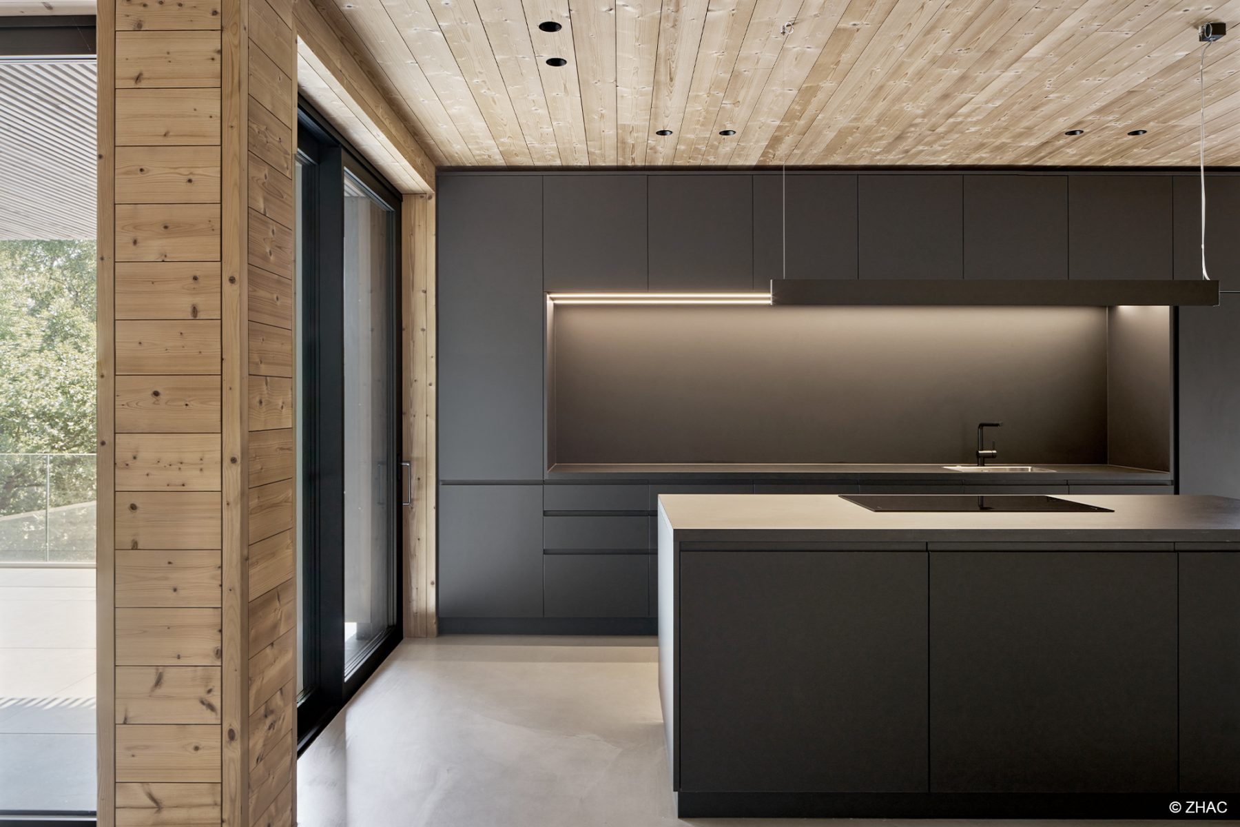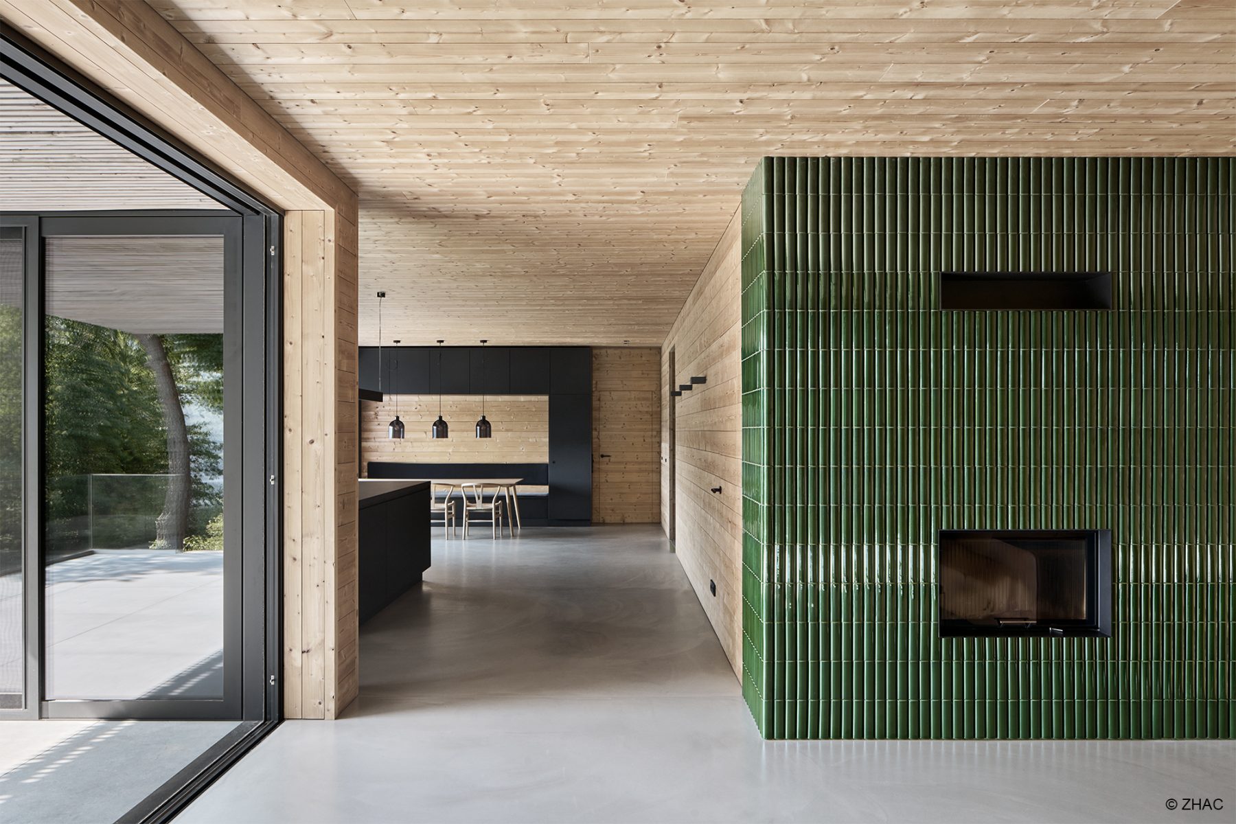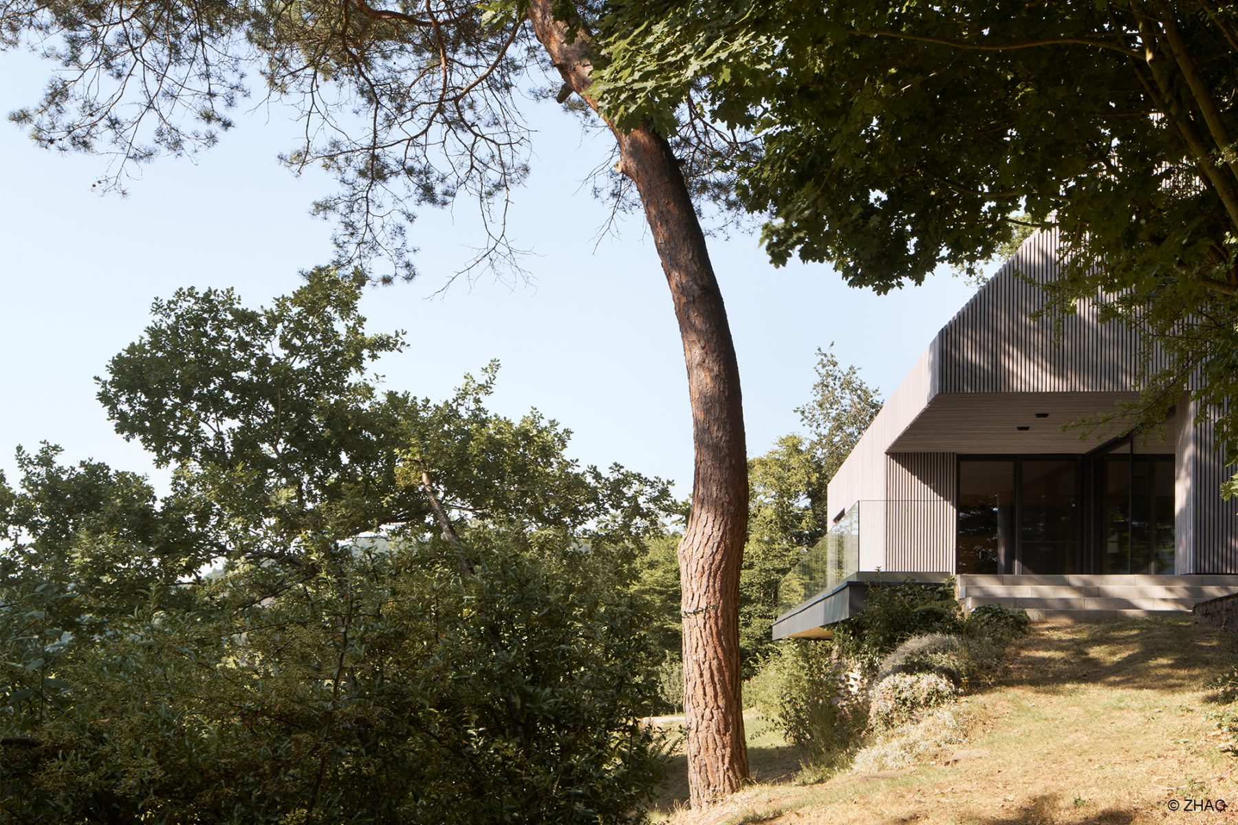 Am Hang, aus Holz mit großen Öffnungen und warmen Licht…