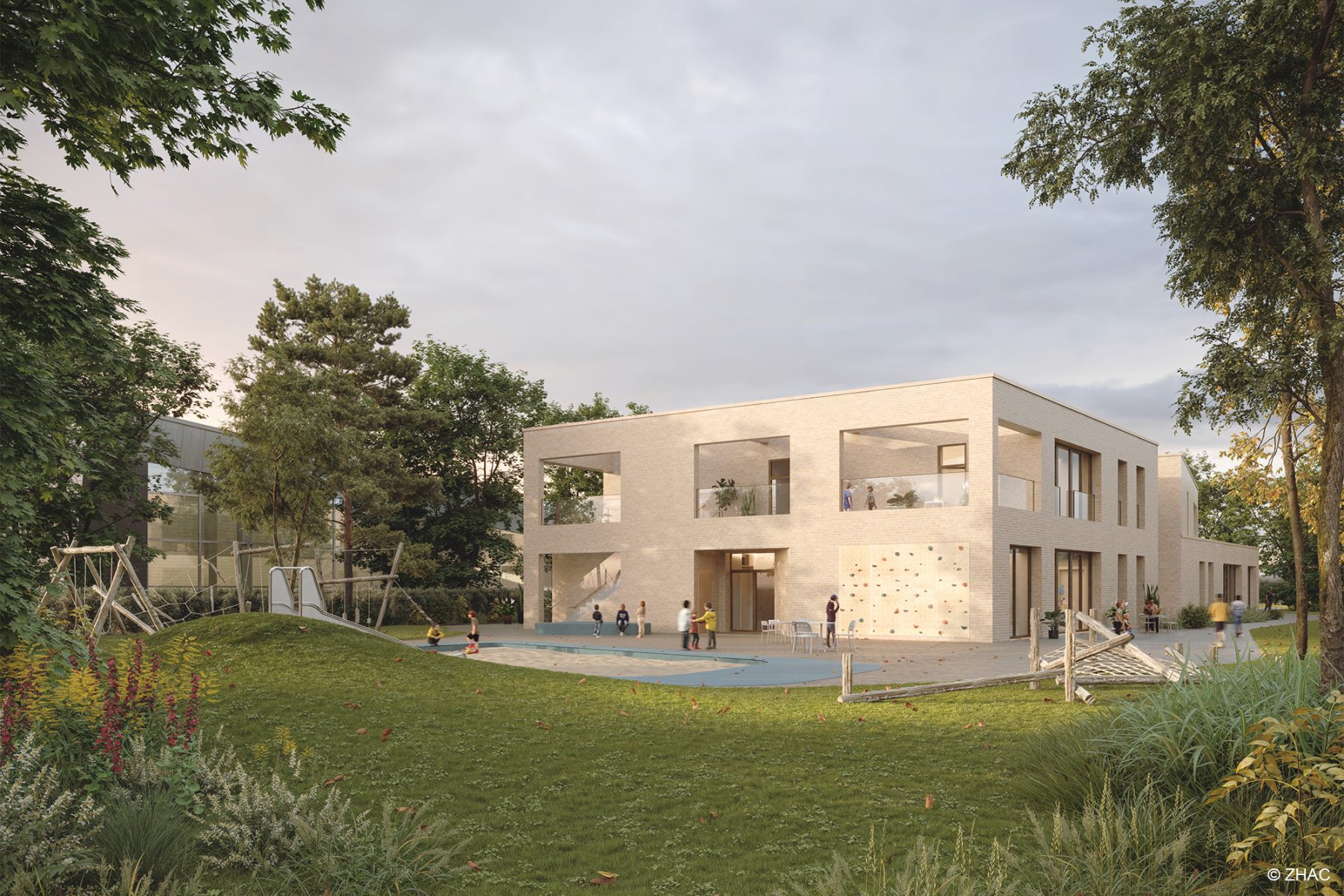 Die neue Schwimm-Kita wird über einen Verbindungsbau direkt an das Wahnbad angeschlossen und verbindet klassische frühkindliche Betreuung mit einem innovativen Fokus auf Wassererziehung und Bewegung.